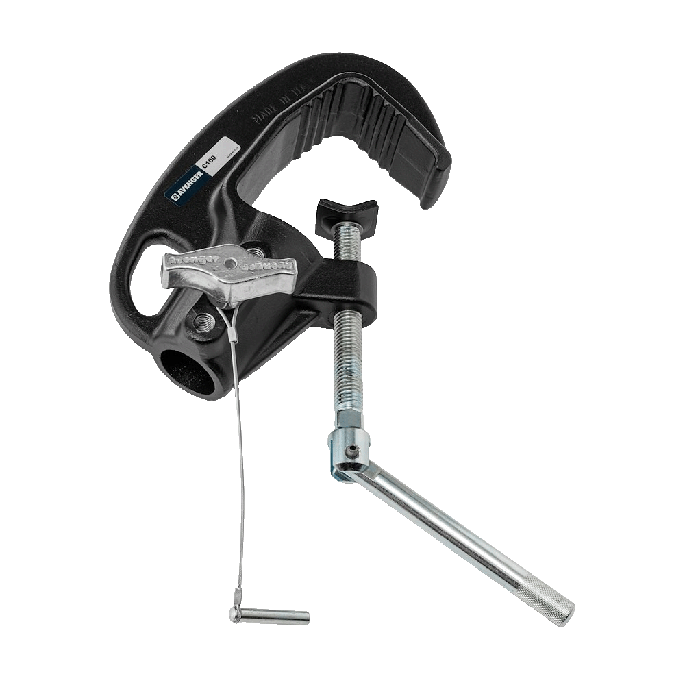The C100 Junior Pipe Clamp has a built-in 28 mm/1 1/8 in receiver. Capable of handling all junior pins, this gravity cast aluminum clamp has a Tommy Bar locking handle and requires no tools when attaching to truss or pipe grids. This clamp has a capacity of 250 kg/551.2 lbs., the jaws clamping range is from 20 mm - 55 mm/0.78 - 2.16 in and has an added safety cable with pin to secure junior pins. Recommended Accessories: C155, E200, C4461-1, C590, C4485, C822, C820, C888UH, C500, C150